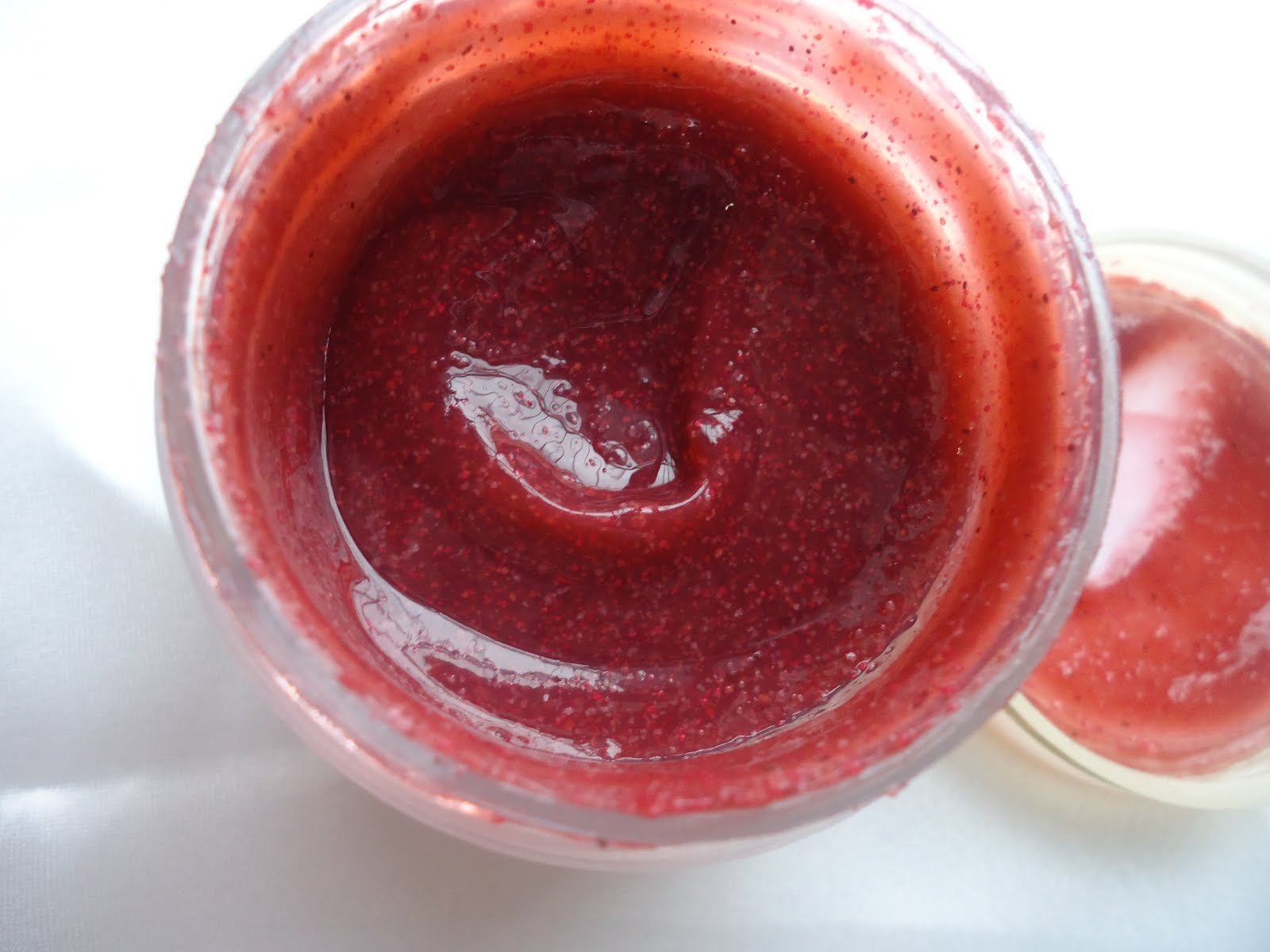 It looks thick and gooey like a jam with small white,black and pink granules in it. It smells decent enough..though some may find it a little strong.