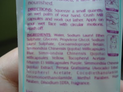 What the Company claims: The innovative mili capsules present in this premium face wash contain herbal extracts of jojoba, avocado and vitamin-e. These active ingredients are delivered directly to your face when applied leaving your skin clean and nourished.