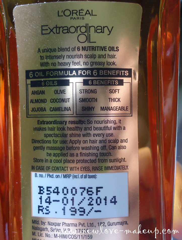 L’oreal Paris 6 Oil Nourish Extraordinary Oil: The Extraordinary Oil has been scientifically created to give your hair the nourishment it truly deserves with three traditional oils and three exotic oils providing 6 specific benefits. It has no heavy feel or greasy look. Almond Oil –Makes your hair Thick, Coconut Oil – Makes your hair Manageable, Argan Oil –Gives your hair Strength, Jojoba Oil –Gives you Shiny hair, Olive Oil – Makes your hair Soft, Camelina Oil –Smoothens your hair