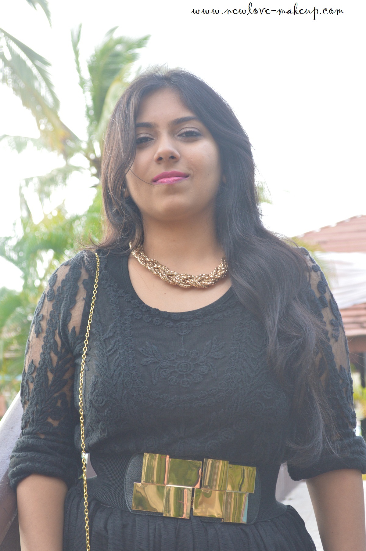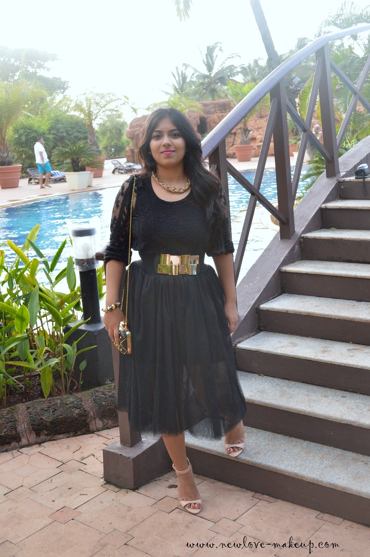 I wore this outfit for the masterclass hosted by Miss Malini on the first day. Its a black crochet lace top paired with a black tulle skirt and combined them with a broad metallic black and gold belt.