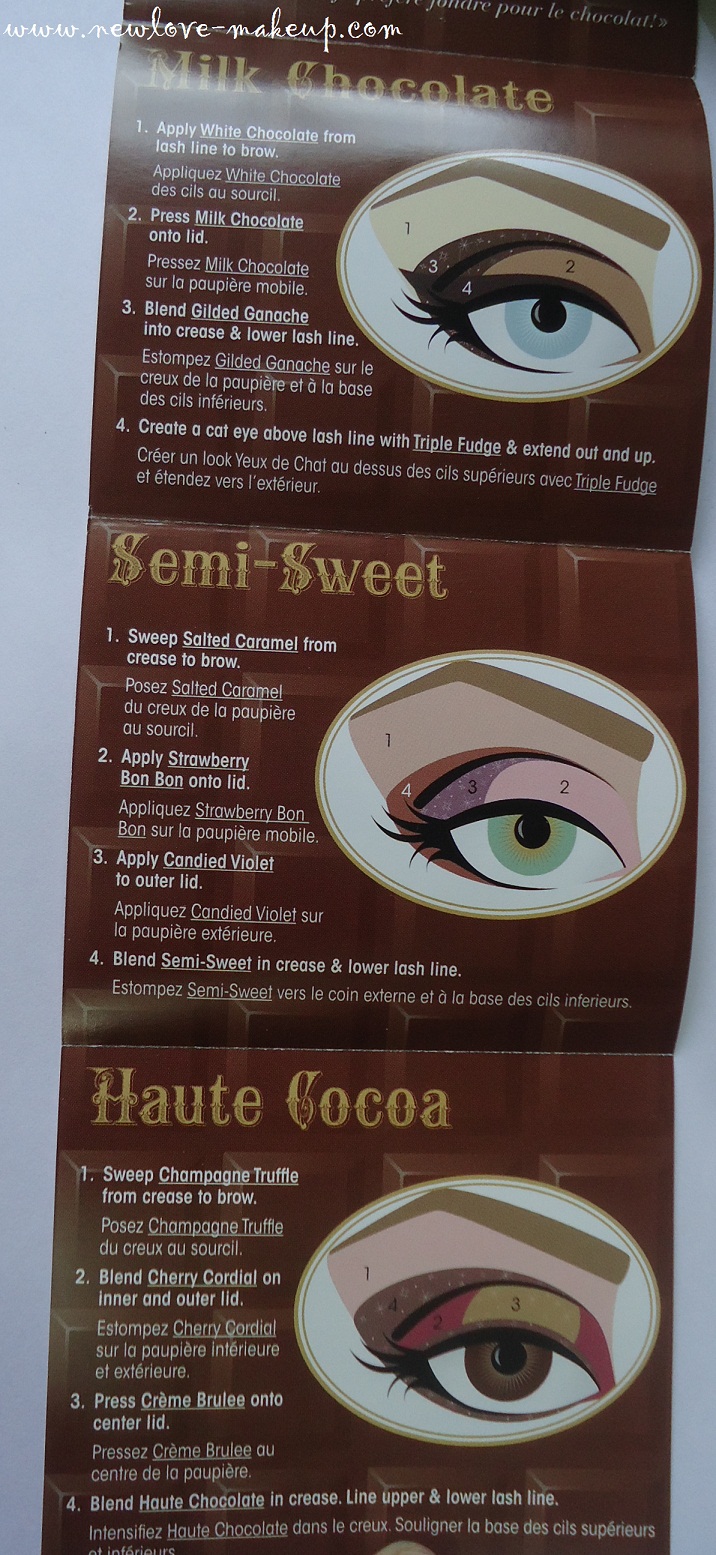 What the Company claims: The Chocolate Bar experience begins as soon as you open the palette and the smell of sweet chocolate envelops you. The eye shadows are pigmented with pure, antioxidant-rich cocoa powder and includes 16 matte and shimmer shades of natural browns, delicate pinks and luscious plums. Includes our signature how-to Glamour Guide with three looks to get you started.
