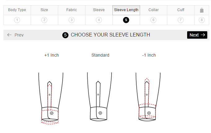 I then went on to the Trendin website, picked a smart blue line formal shirt and 2 pairs of trousers. Shirts in MYFIT have 7 step by step customization options starting with body type..and the main being sleeve length +1 inch and -1 inch. We went for +1 inch, that being the major problem usually coz of his height.