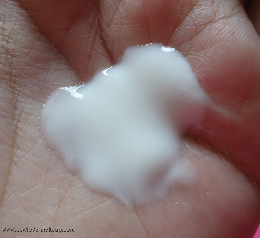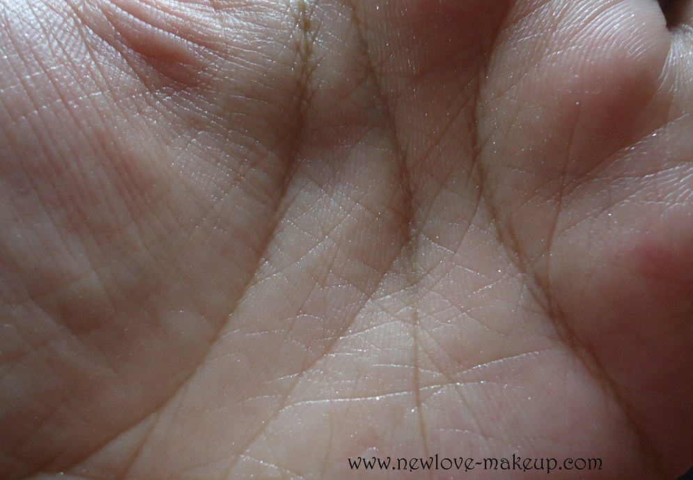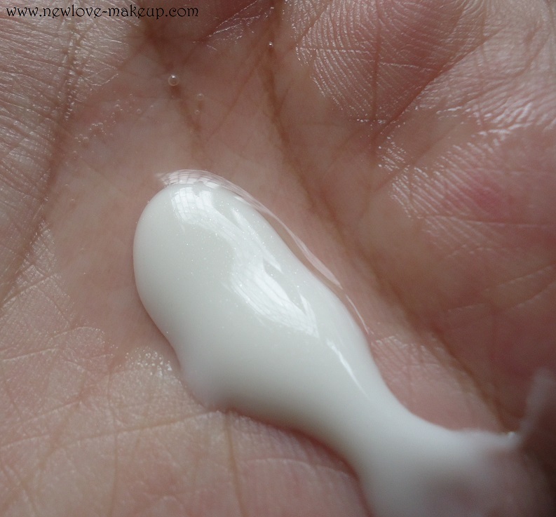 It is a white colored cream, very light and runny in texture, it feels almost water based, even though it is oil based. It has very tiny shimmer particles which will be left all over your hands, after using it on the hair.