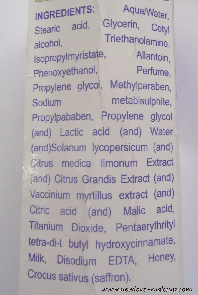 The key ingredients of this cream are milk,lemon and honey. Lemon and the lactic acid in milk are especially known to de-tan the skin. Also, honey keeps the skin pH balanced and moisturised. It is dermatologically tested and safe for all skin types.