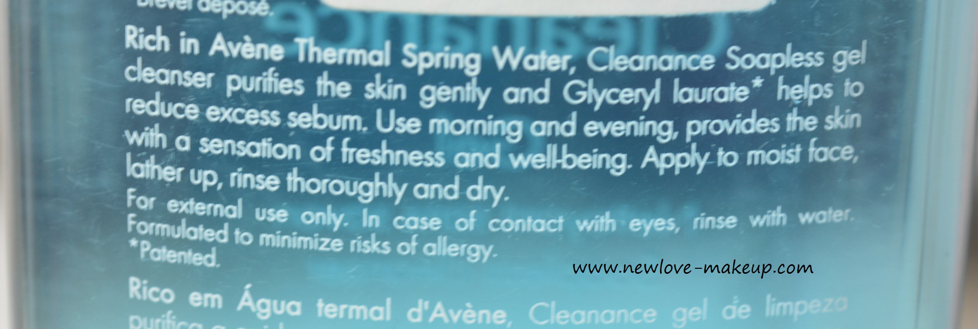 What the Company claims:  This soap-free and paraben-free gel gently cleanses and purifies your skin while respecting its pH. It cleanses the skin gently without abrasion (no rebound effect). It is suitable for young, oily, blemish-prone skin as it purifies the skin and controls oil secretion, leaving your skin fresh and non-irritated. It contains 60% Avène Thermal Spring Water which has amazing soothing properties and the new sebum-regulating ingredient Glyceryl Laurate. This cleanser prepares the skin for treatment. It is an economical product, as a small quantity is enough to be effective.