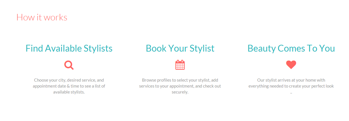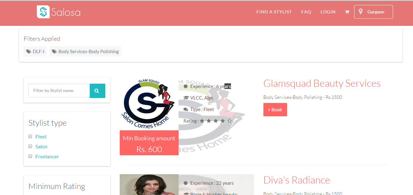 What you have to do is select an attendant you need, Male or Female and then select your area and the type of service and click on ‘Find A Stylist’. You get a list of options ranging from freelancers to chain of salons to fleet and their prices and minimum booking amount.