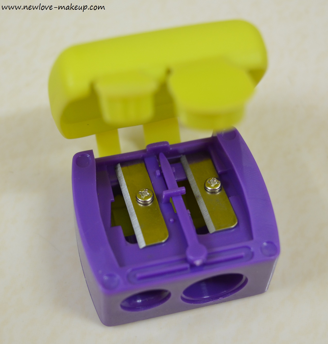 The sharpener is also purple but has neon green cap which is hygienic and safe from dust, etc. It sharpens the kajal perfectly and can also be used for other eye pencils and lip crayons.