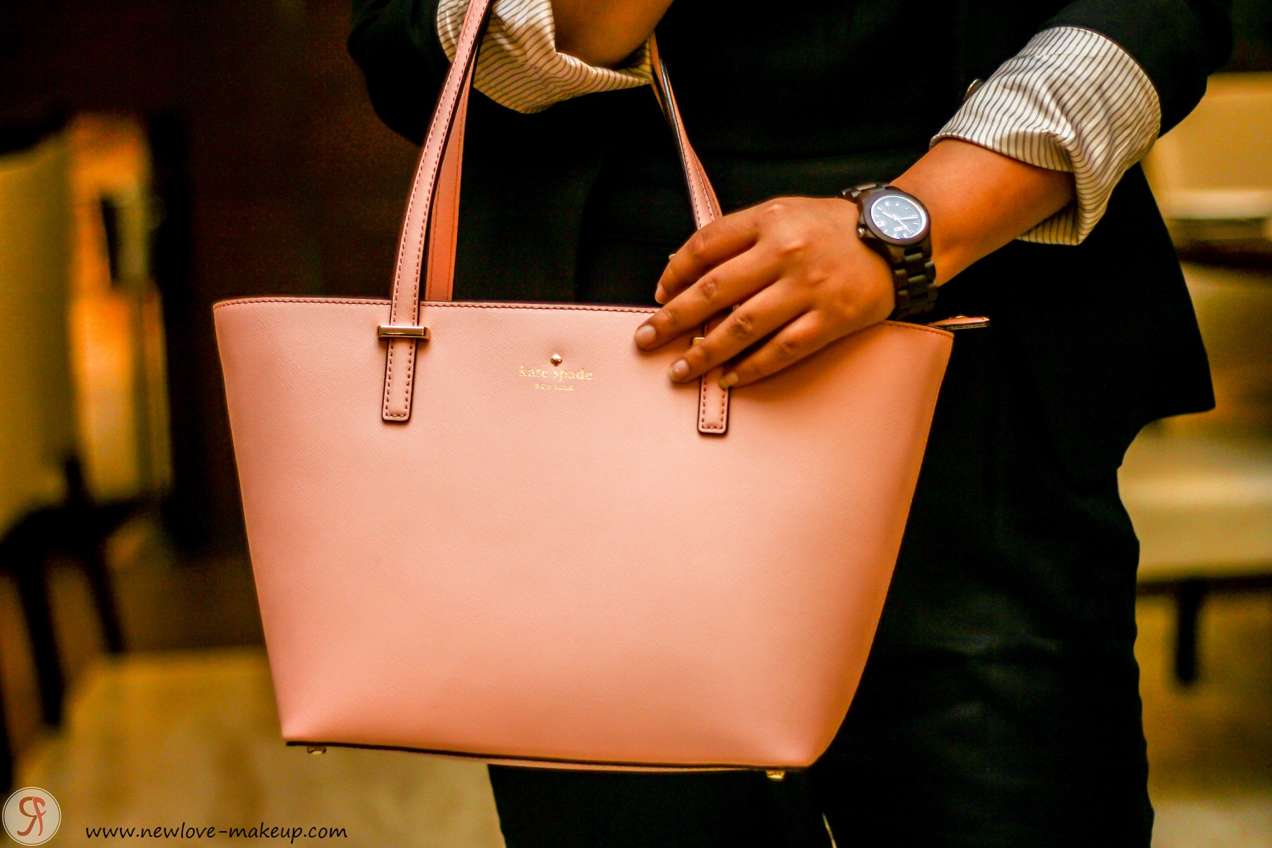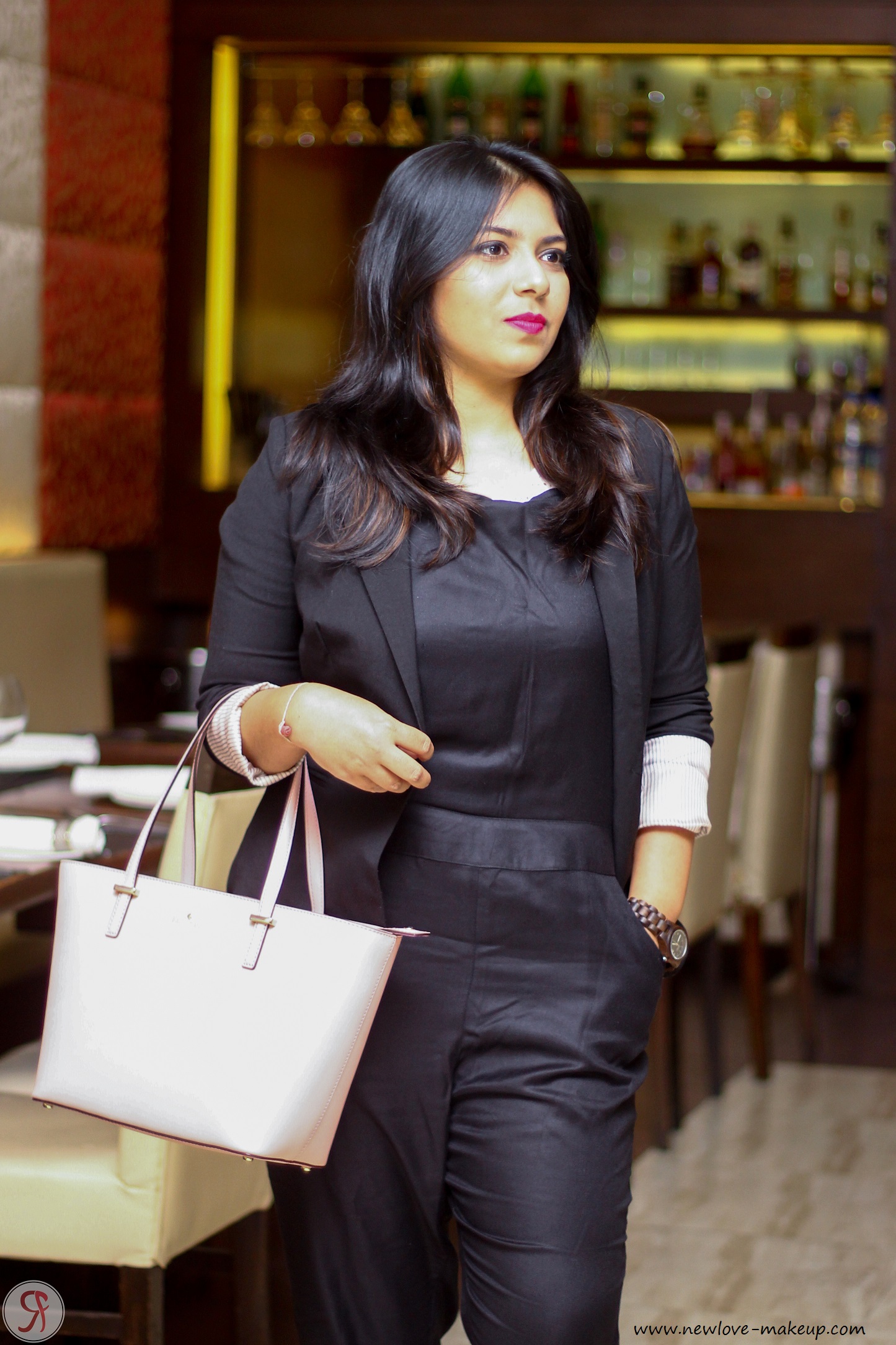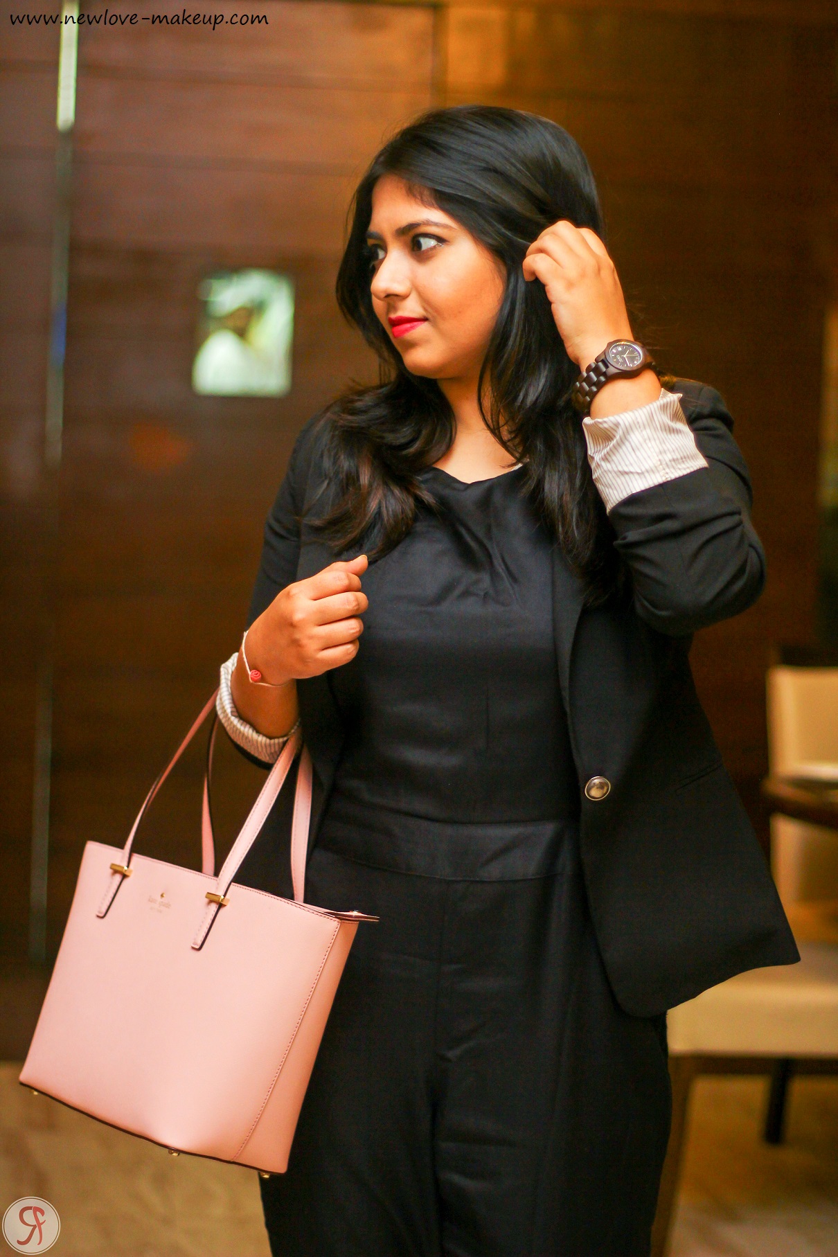 I am wearing this basic, black trouser style dungarees with a simple white crop top and dressed it up with my trusted black blazer and nude heels. I added a pop of colour with this pastel pink Kate Spade bag. My current favourite wood watch from Jord watches completes this look!