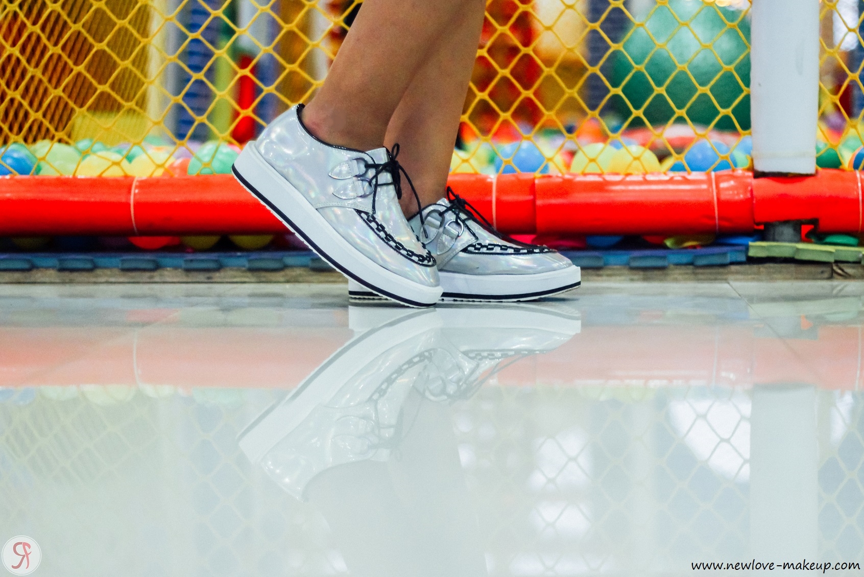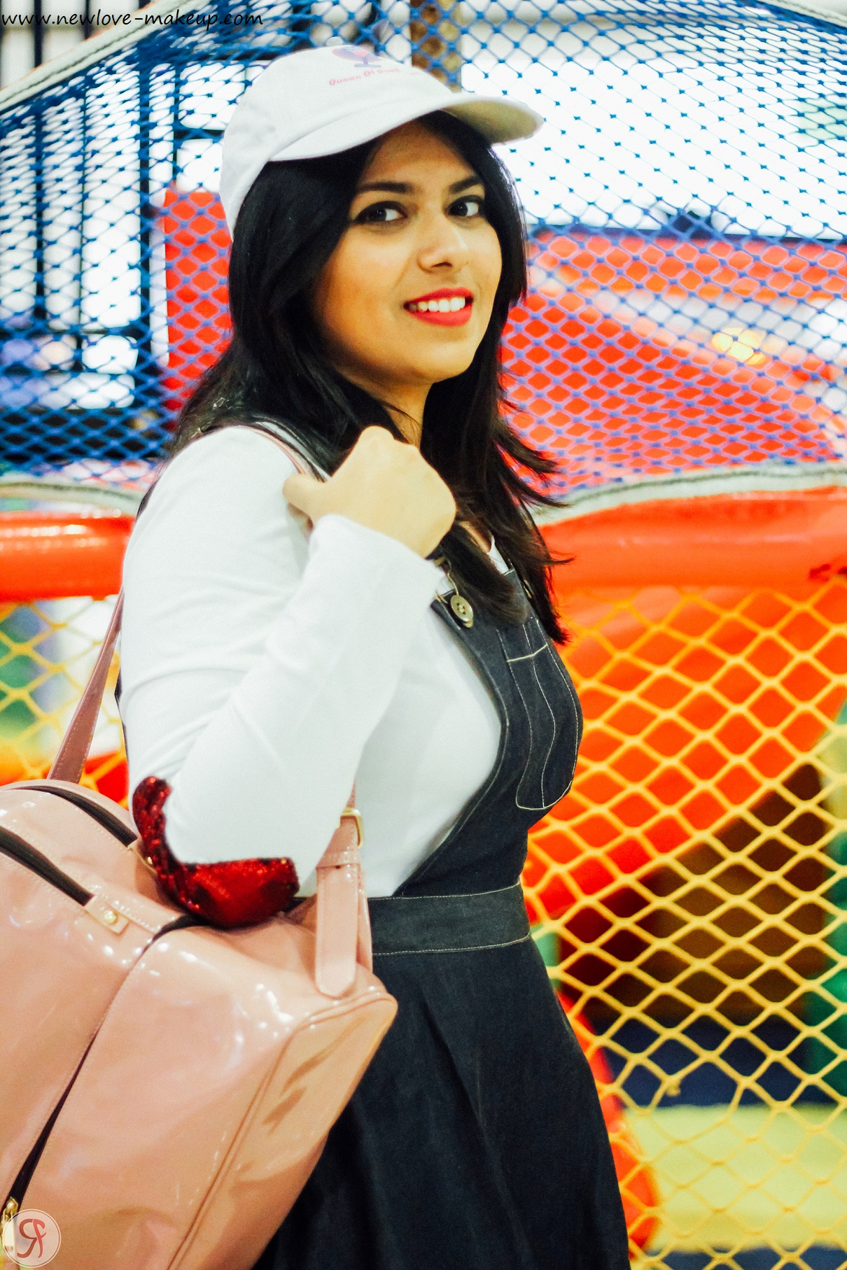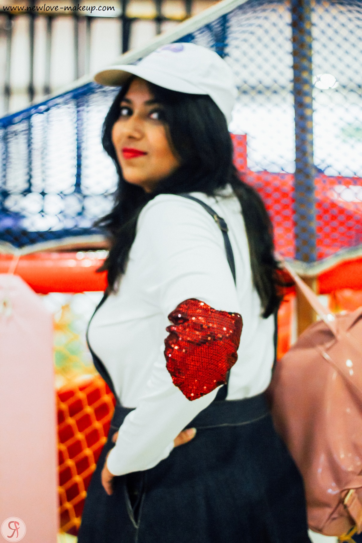 Of course, we can’t forget the casual way when it comes to dungarees. I am wearing this denim skirt dungarees in a fun, casual way with a white cap, the ‘Rose Chic’ rose pink back pack and holographic silver shoes. The white tee has red sequin heart on the elbows 🙂