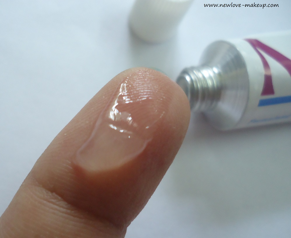 It is a transparent gel, with an unpleasant smell. I would say going easy with the quantity applied, as it is very expensive! It forms a layer on the skin and when you have a bath next, the layer kind of peels off like the dead skin coming out when you rub your skin.