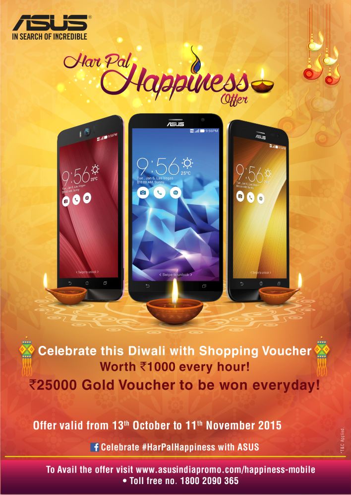 Asus India is brightening up lives this Diwali with the “Har Pal Happiness Offer”, where customers buying a ASUS Zenfone will get a chance to win Flipkart gift vouchers worth Rs.1,000 every hour. And, one lucky customer will also stand a chance to win gold vouchers worth Rs.25,000 every day! The offer is available HERE.