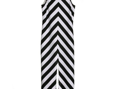 Crafted with soft-handle cotton-mix fabric. Featuring black-white striped print, scooped neckline, sleeveless style, deep splits to the hem.