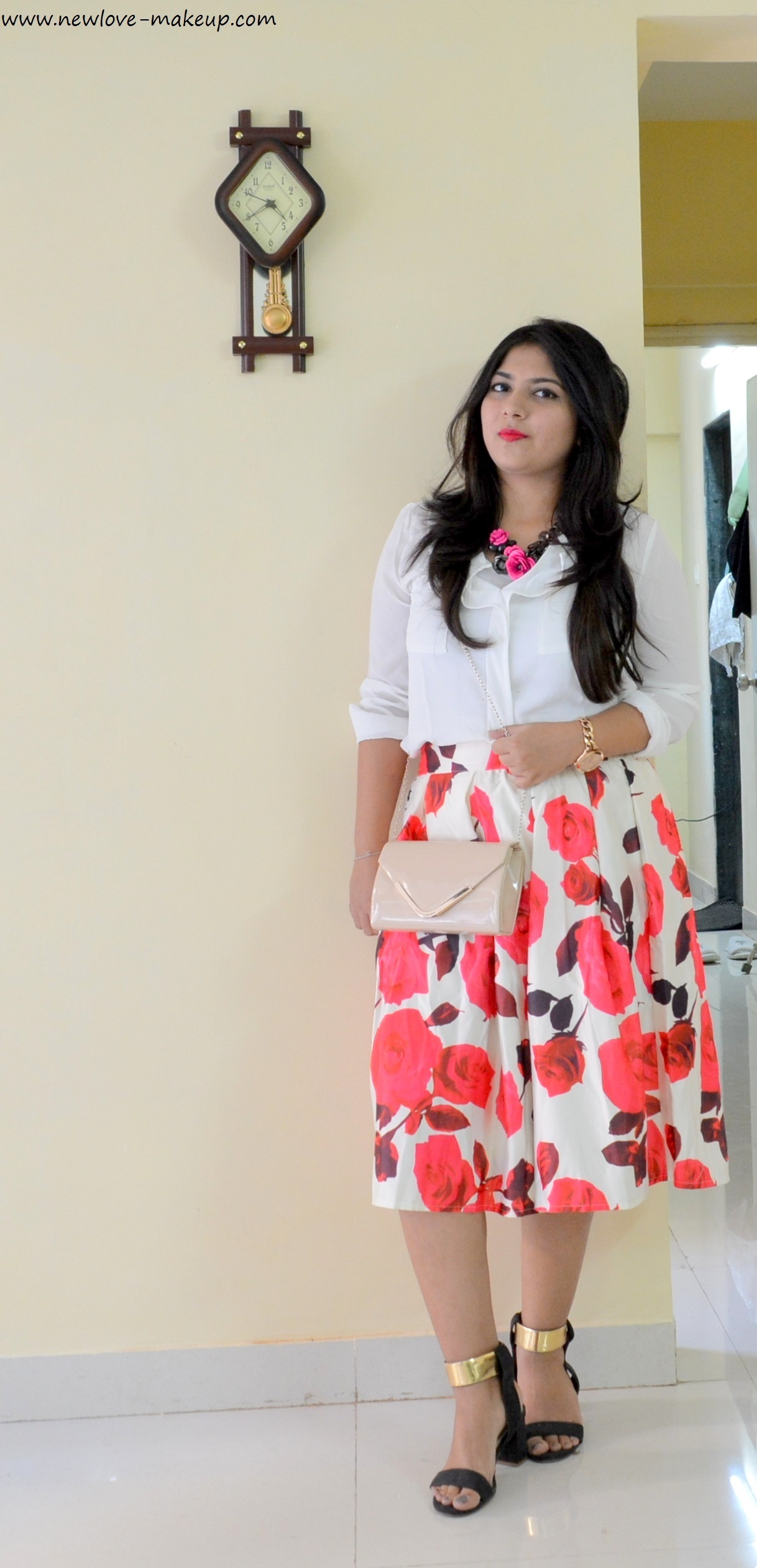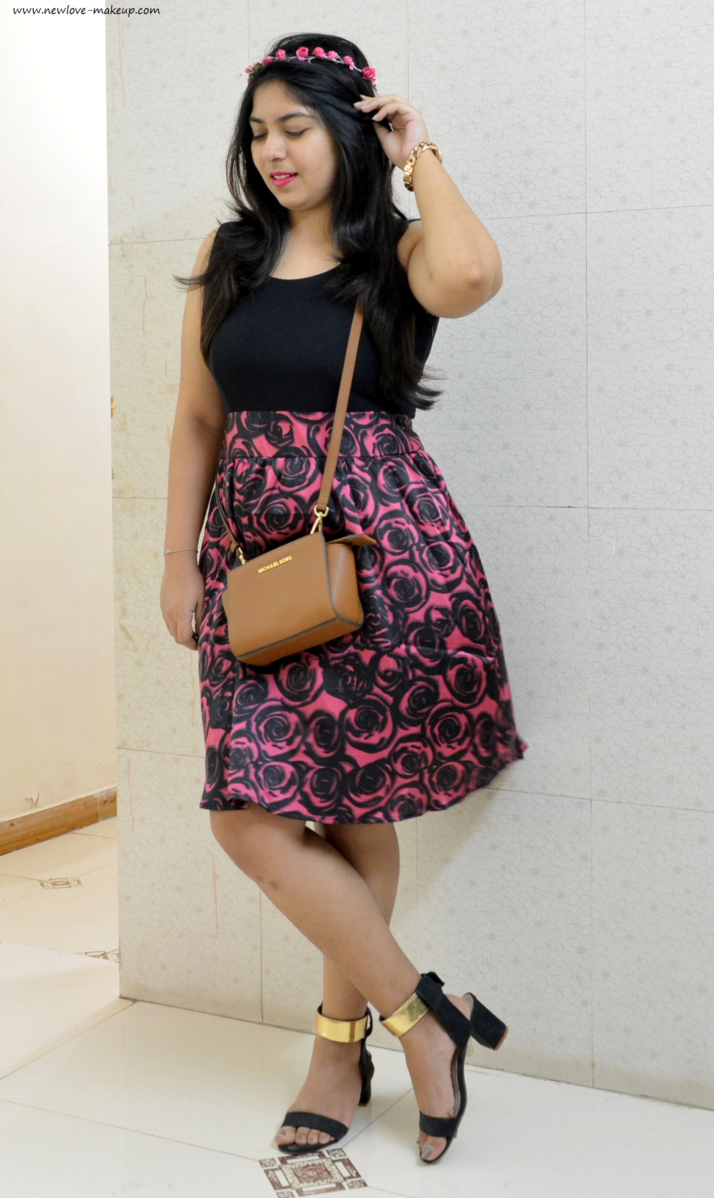 I love midi skirts and this rose print one is my most favourite. I paired this skirt with a simple white shirt and folded the sleeves. A black and pink roses statement necklace and the same watch and bag to complete the look. My same old black and gold ankle strap sandals. I wore this to the Avene #SensitiveSkin event as the theme was white and pink.
