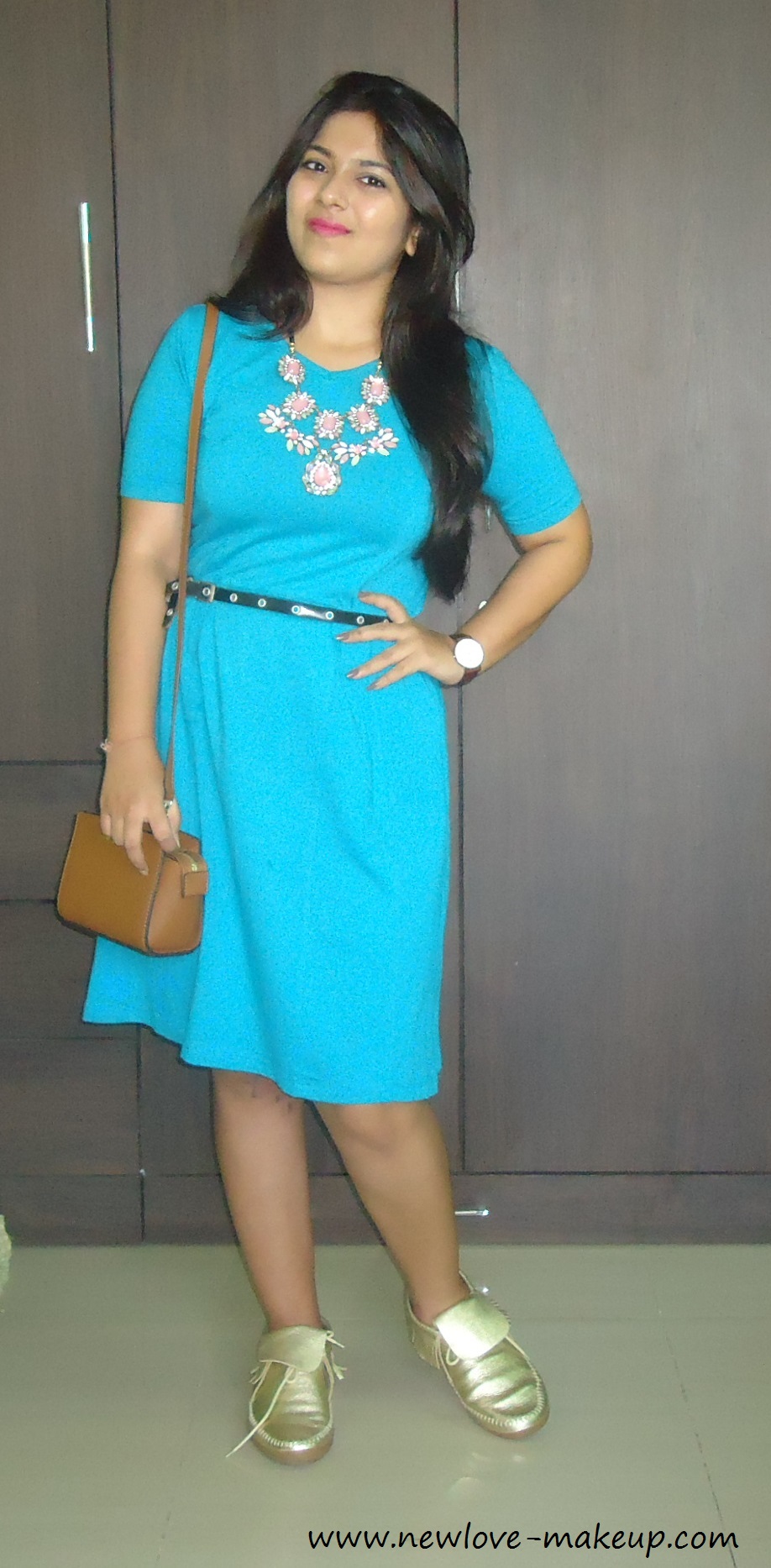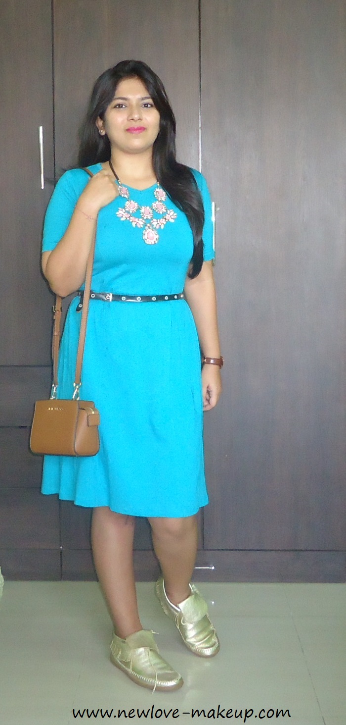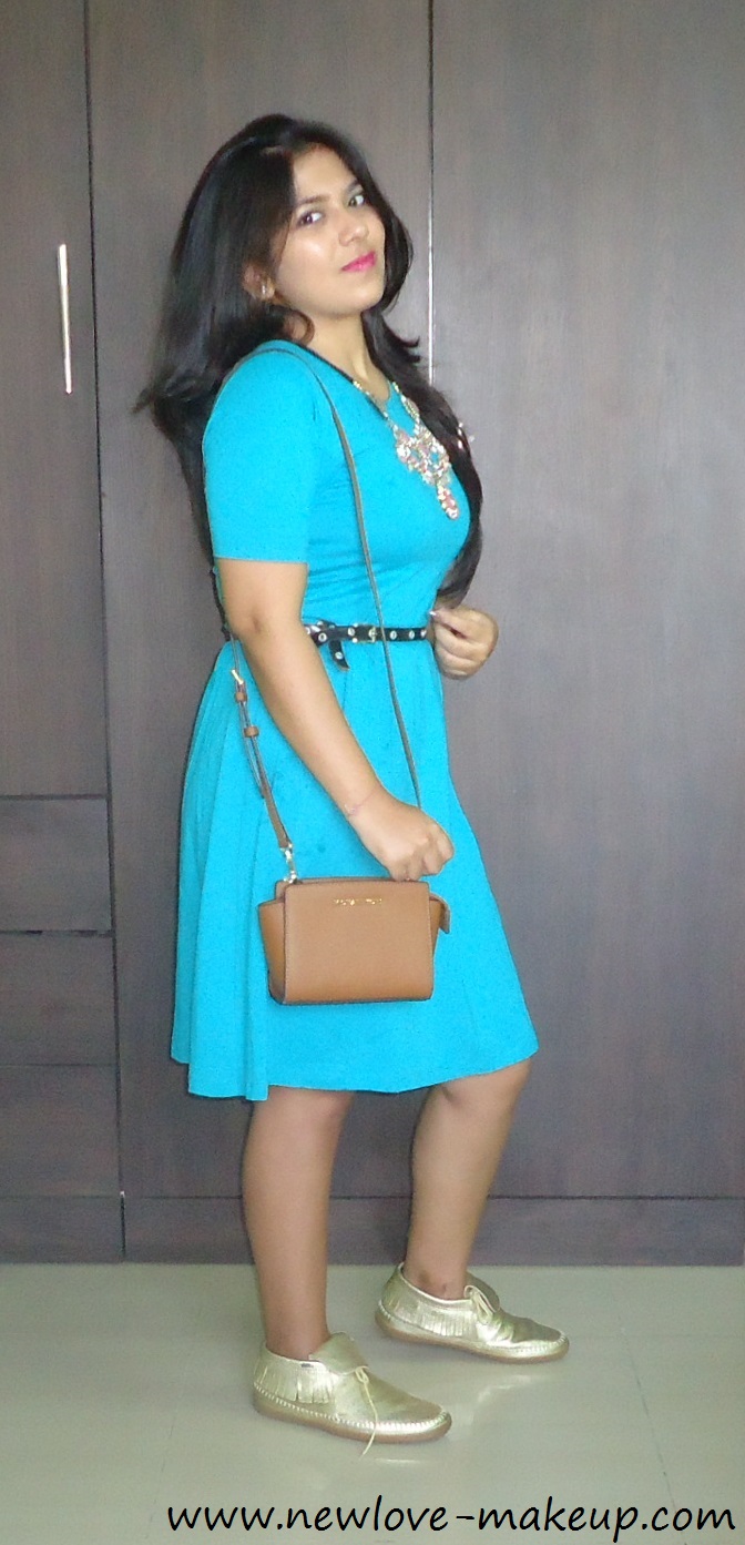 A blue ‘Cinderella’ t-shirt dress from Disney and Kook N Keech collaboration for Myntra. I paired it with my tan brogues and Michael Kors Selma. I added a glitter gold belt to define the waist and give a shape to the dress. And my Daniel Wellington watch and a gold and black layered statement neck piece.