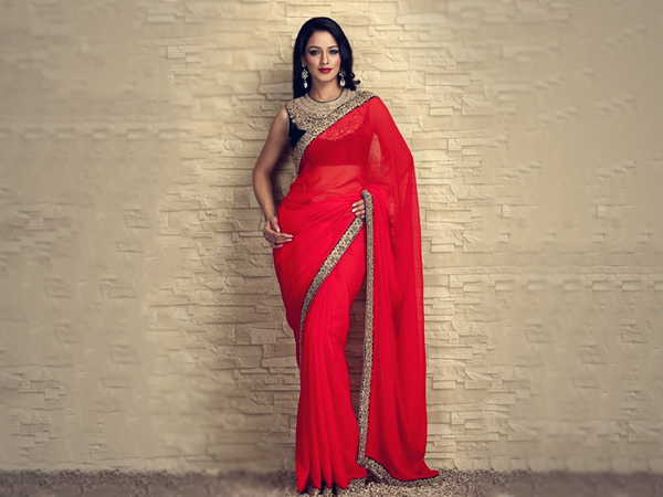 A classic red georgette saree with a heavy embroidered border. It is classy and can be worn on weddings and receptions with the right jewellery and accessories.