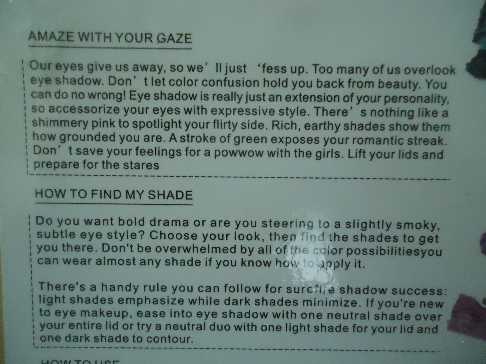 Overall quite a nice mix of colors..and mix of matte and satin shades..good highlighters and a pretty dark matte black..matte blending shades..and a nice olive green, grey, burgundy, plum and brown..shades which are quite wearable..