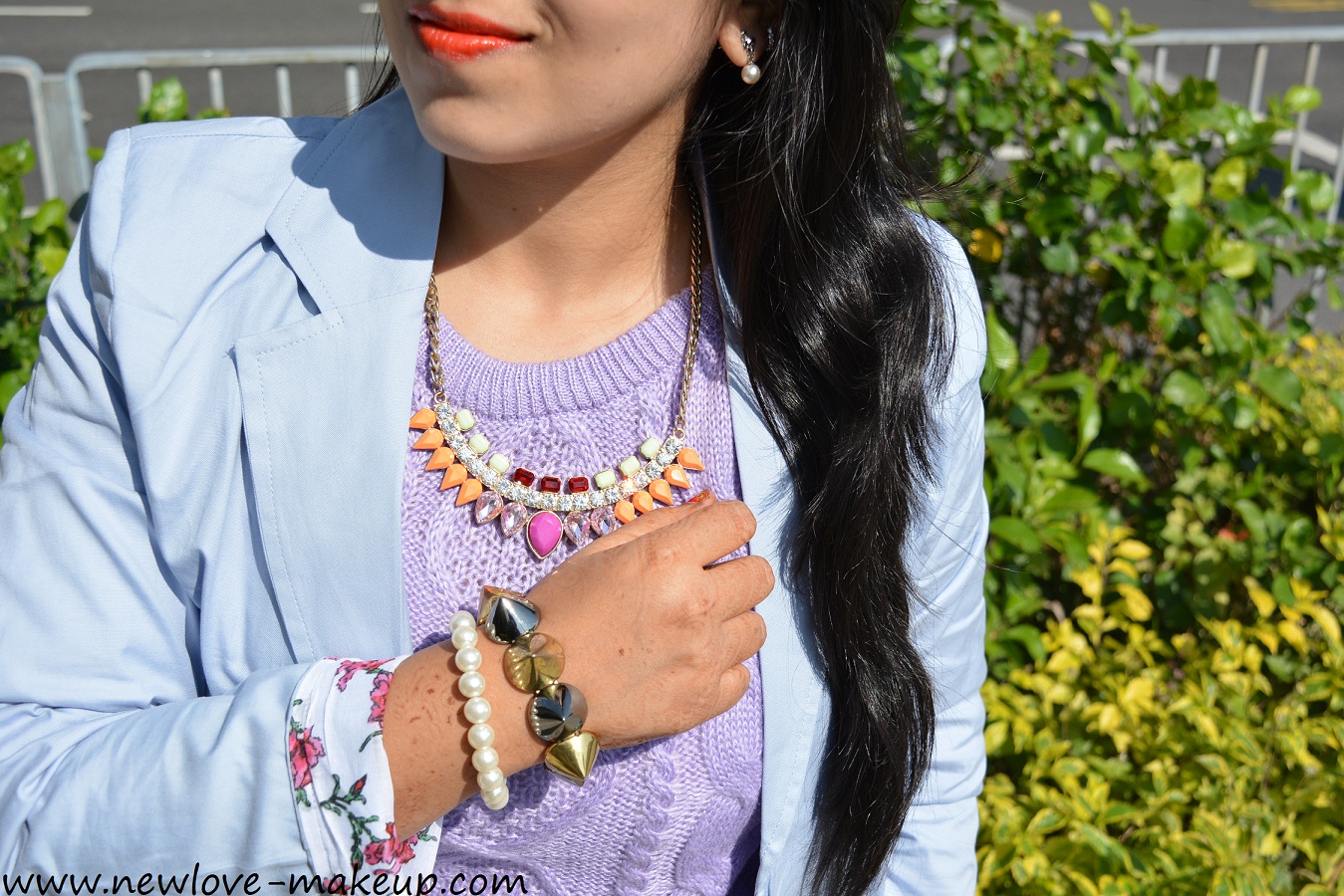 I loved the pastel on pastel combo and the neon necklace and the bright lipstick adds a pop to the outfit. The blazer is cotton chambray and super light and comfortable, still keeps you warm and the folded floral sleeves look so chic!