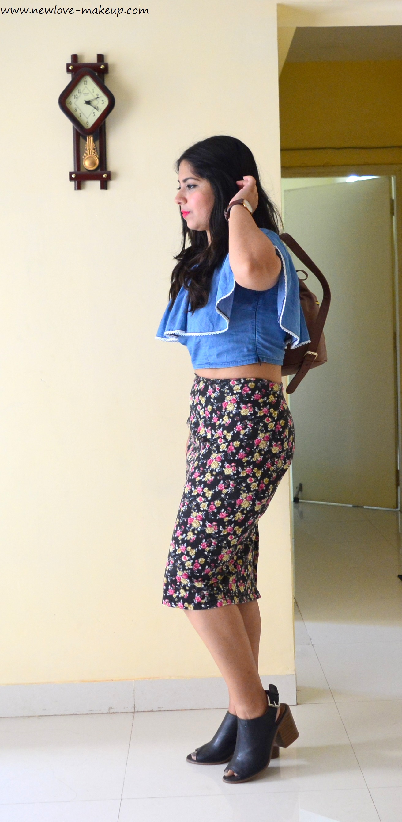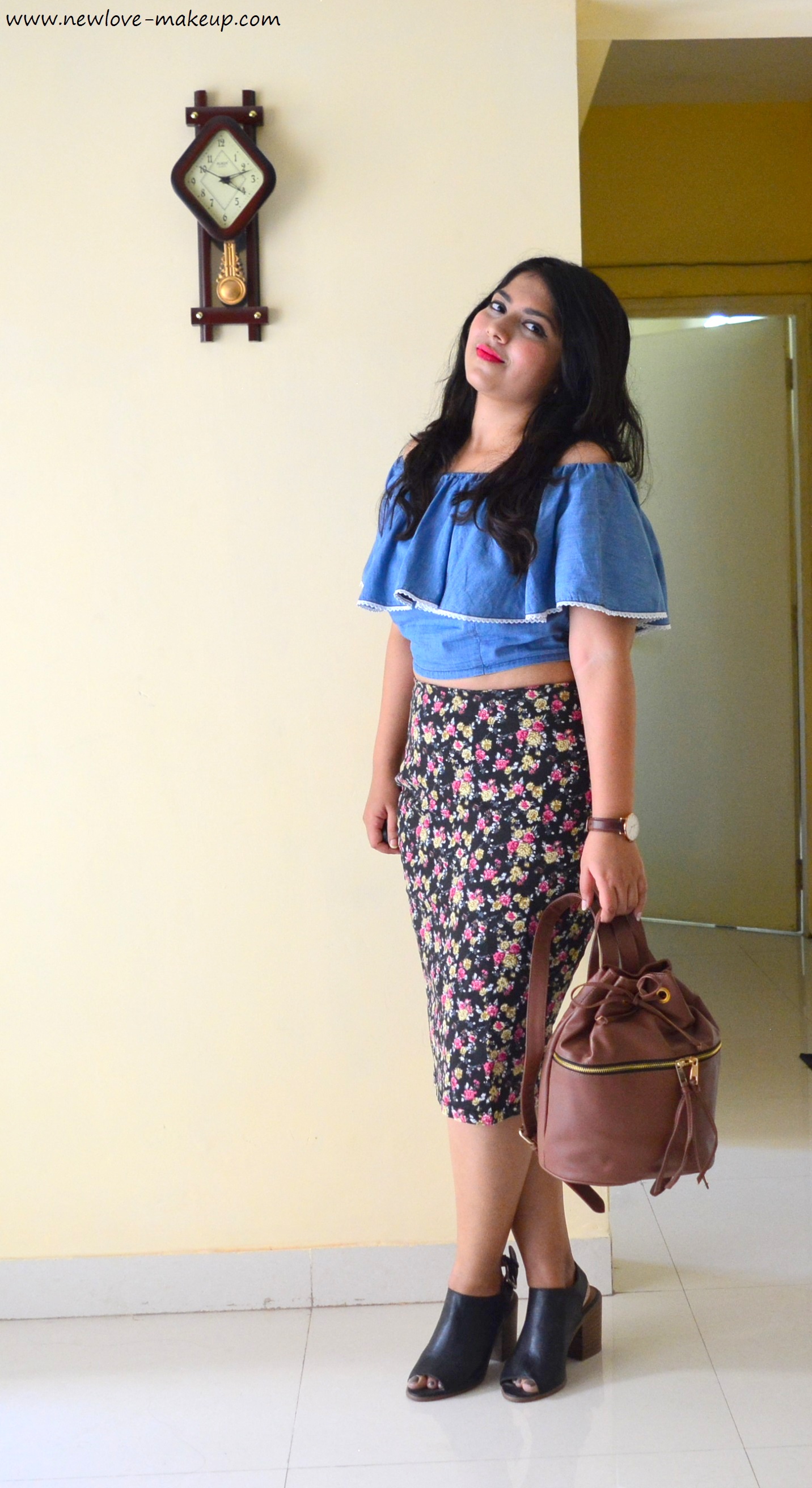 OOTD: Denim Blue Off Shoulder Crop Top, Floral Pencil Skirt
