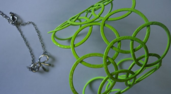 I got this circle shaped cut out neon green cuff and a simple bowknot silver bracelet from Oasap..