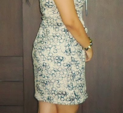 Its a sleeveless cream printed lace dress..it clinches at the waist and makes one look slimmer..I love how it perfectly fits me..