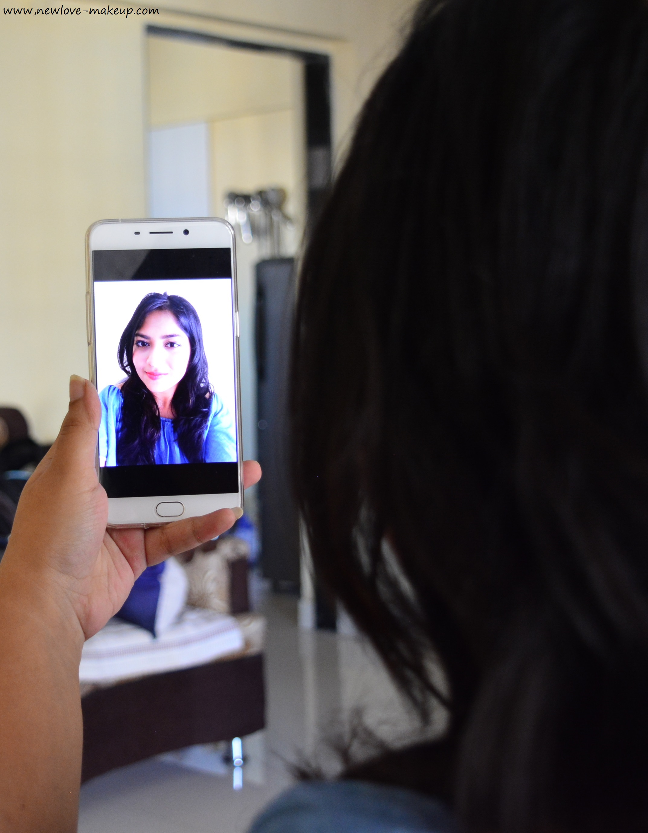 Now when you keep the phone exactly at the centre, you may look squint as both your pupils face the lens and also the features are not very flattering from the centre. Slightly tilt your face towards left or right, whichever side is your best angle. You will find it with trial and error. See the difference here from the centre and slightly tilted..