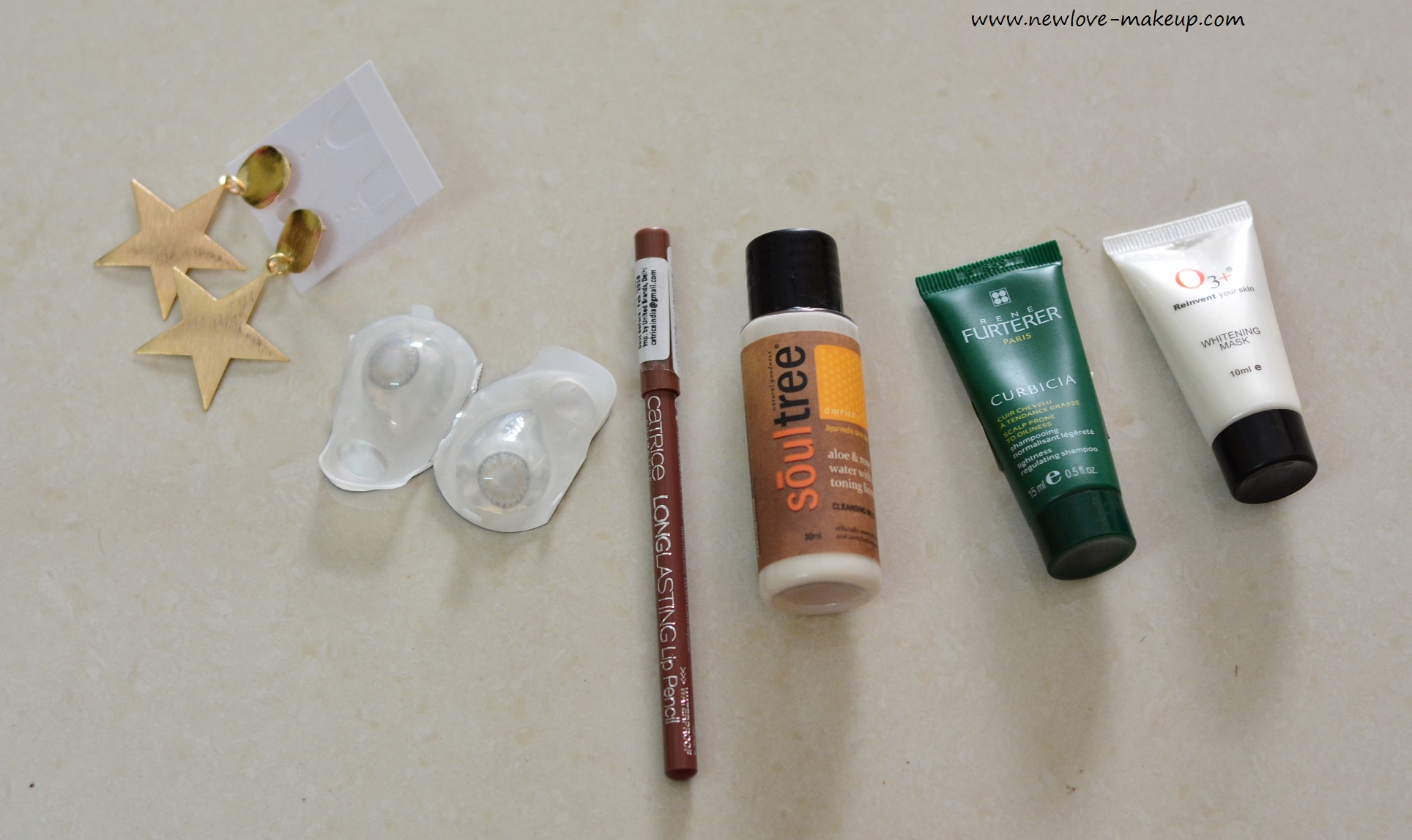 There are 6 products in this month’s bag which is pretty good. I love the Catrice Lip pencil and the earrings. Also I haven’t worn colored lenses post I got my lasik done, so would definitely be trying these once in one of the makeup looks in the future.